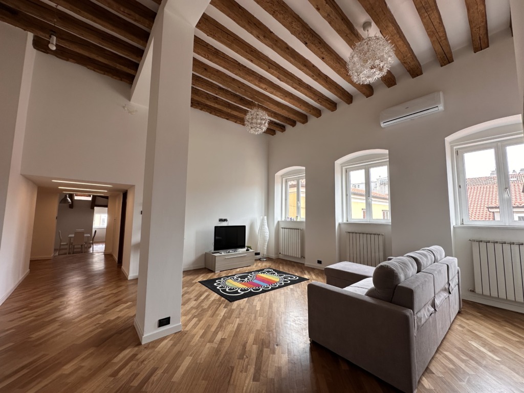Signorile palazzo d’epoca ubicato nel centro storico di Trieste, a due passi da Ponterosso, le Rive e Piazza Unità d’Italia. Appartamento sito all’ultimo piano con introvabile lastrico solare, risulta silenziosissimo in quanto non affaccia su strada. Internamente si caratterizza da ampi spazi abitativi, movimentati grazie a soffitti alti, zone soppalcate e mansardate e la presenza sia di finestre che di abbaini e lucernai. Atrio d’ingresso, ampio salone molto luminoso in quanto servito da tre finestre, ampia zona pranzo con cucina. Camera padronale con bagno di servizio, armadio e zona letto sul soppalco finestrato. Seconda camera con letto soppalcato. Ampio bagno completo finestrato con vasca idromassaggio, ripostiglio e soffitta. Lastrico solare di proprietà di 120 mq recentemente rifatto con splendido affaccio sul centro cittadino e Castello di San Giusto. Ottime condizioni interne, riscaldamento autonomo, infissi in pvc, climatizzato, travi a vista.